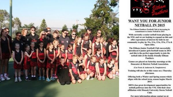 In 2014, a call went out for netball players to join a newly formed club, affiliated with the Eltham Panthers Football Club.  At the time, the football club had a senior netball team, but no junior teams.  Two keen netball mums, Deb McCurdy and Jo Arrowsmith, saw an opportunity to create a new club, and together with the support of Kirsty and Brendan Cottier, the Eltham Panthers Junior Netball Club was formed.